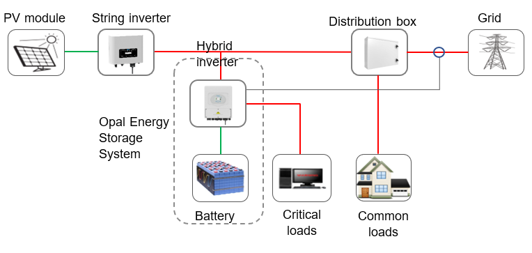This configuration is ideal for new installation or when there is a need to replace an old existing grid inverter and at the same time with the intention to upgrade the system with energy storage system. A DC coupled hybrid system is simple and more reliable in general compare to an AC coupled hybrid system. Loads need to be separated into common non-critical loads and critical loads. Typical critical loads are lighting, refrigerator, WIFI, computer, etc. Non-critical loads refer to air-conditioning, kitchen appliances, etc.